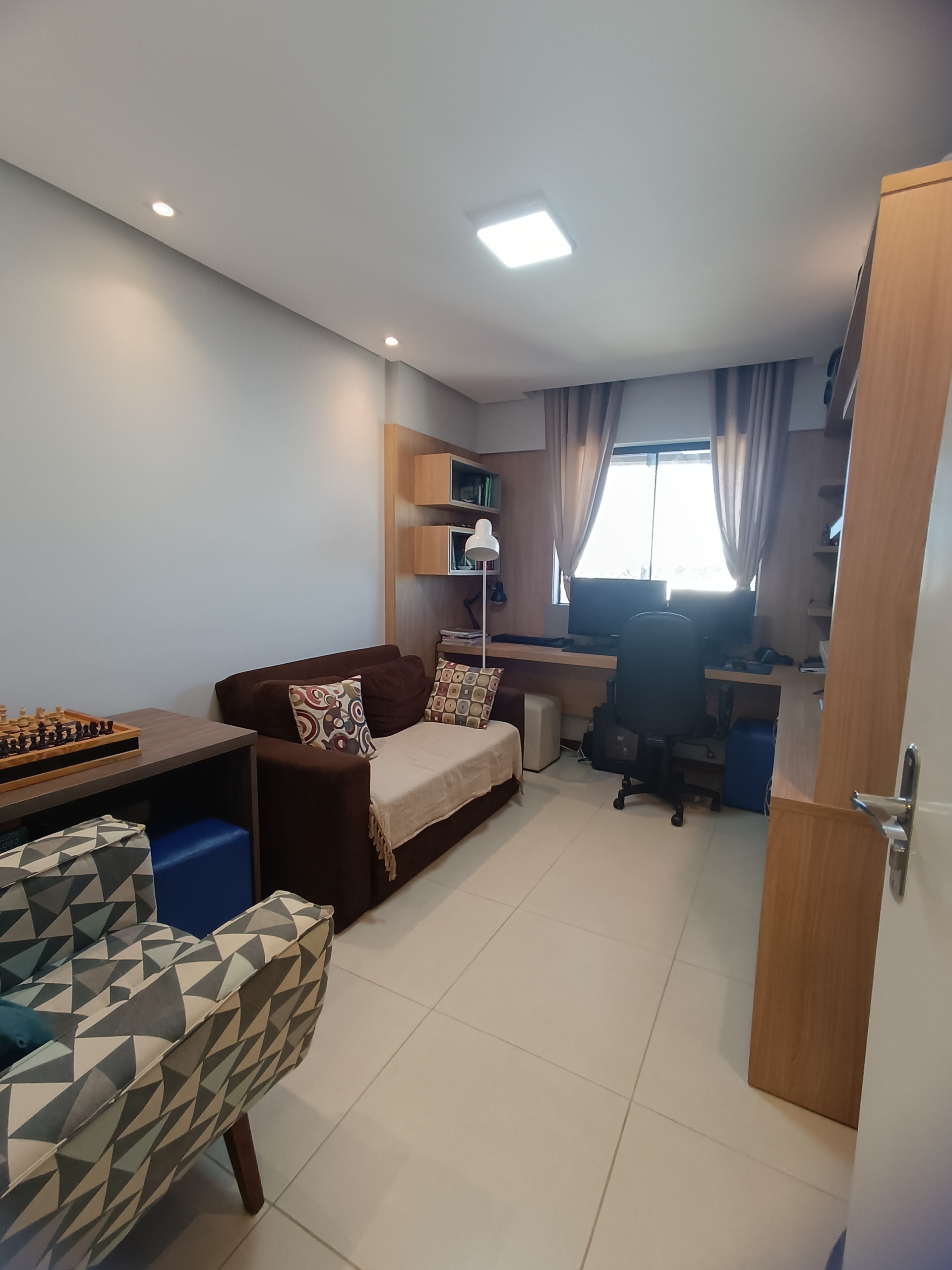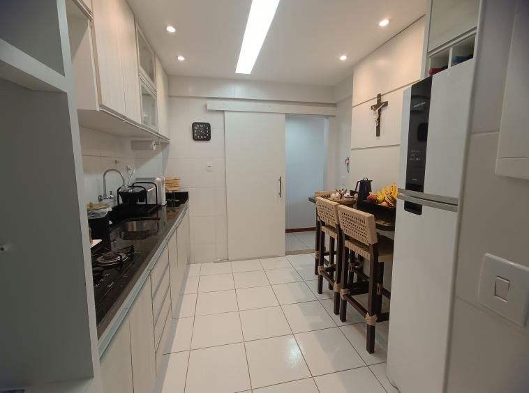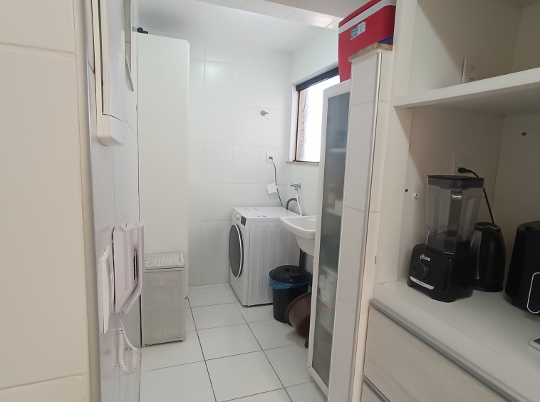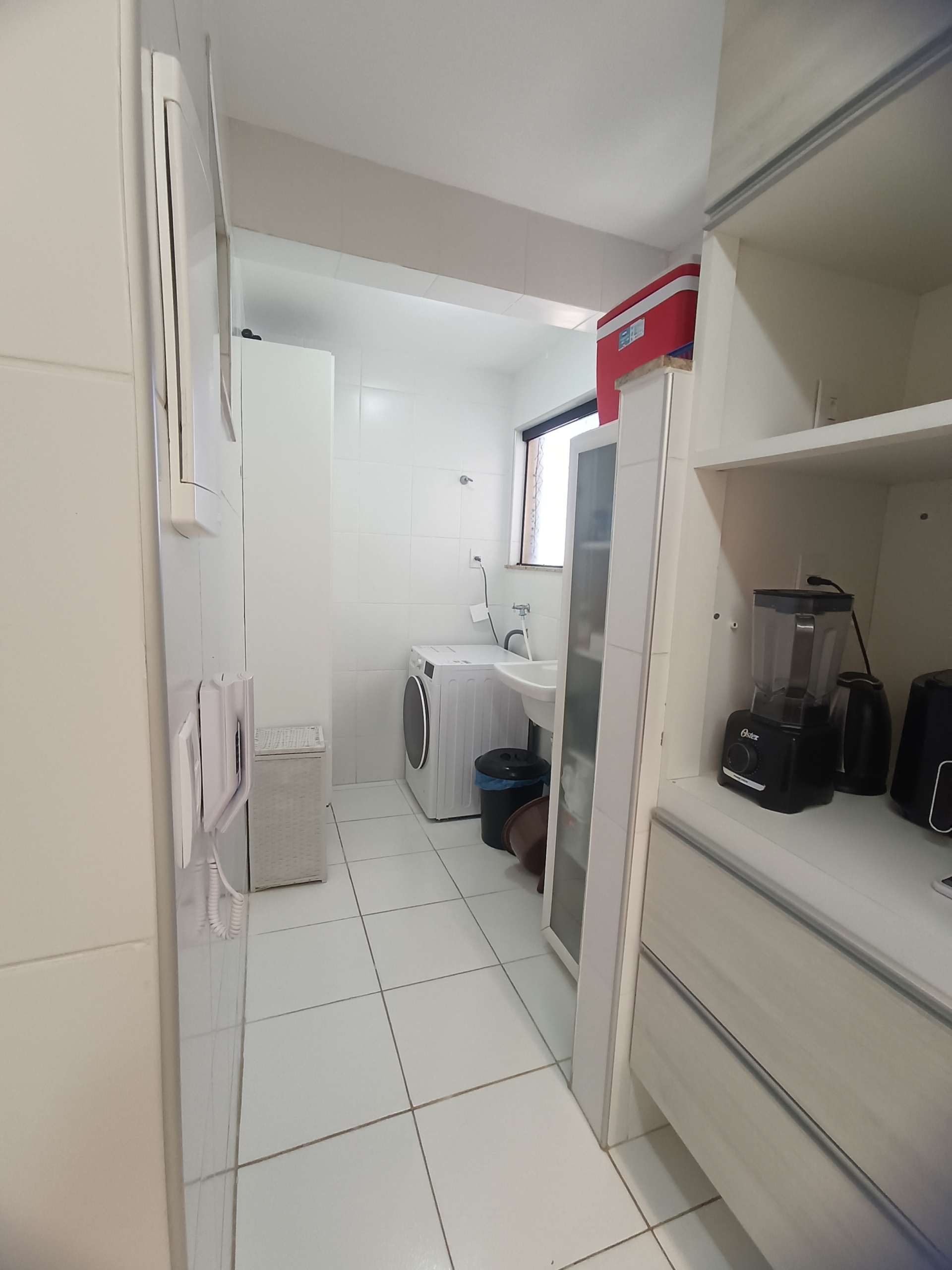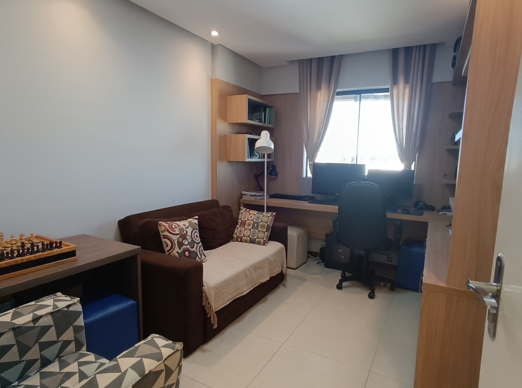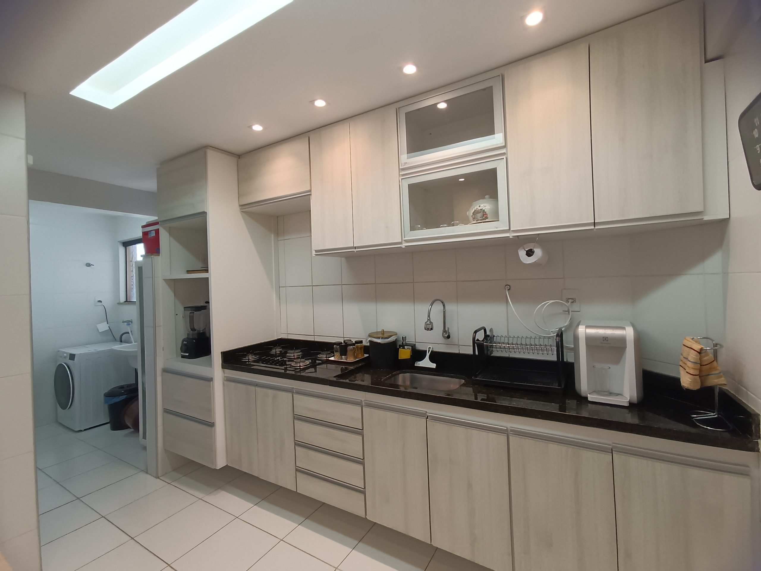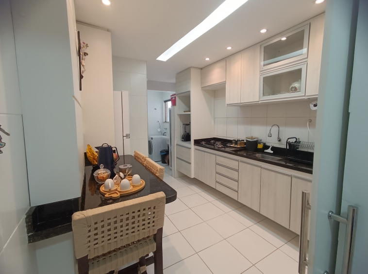 A cozinha é equipada com armários modernos e área de serviço prática, enquanto o terceiro quarto pode ser utilizado como escritório ou quarto de hóspedes, com armário estante planejado para maximizar o espaço.