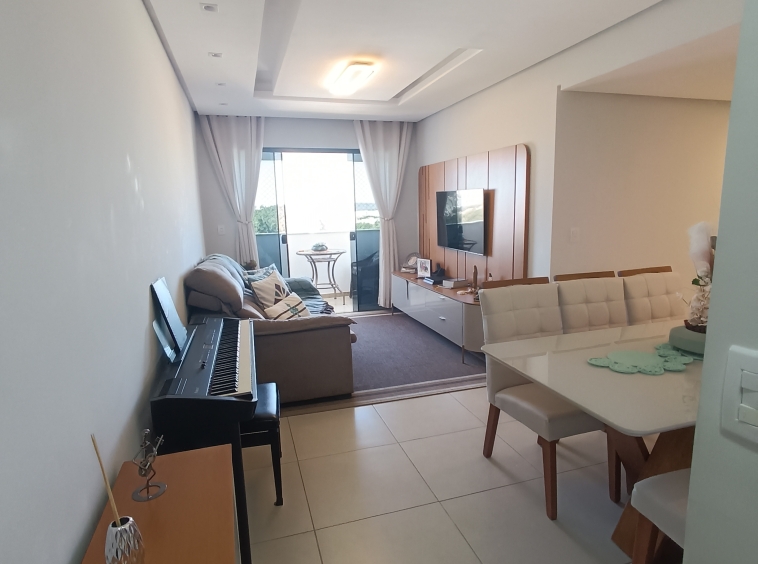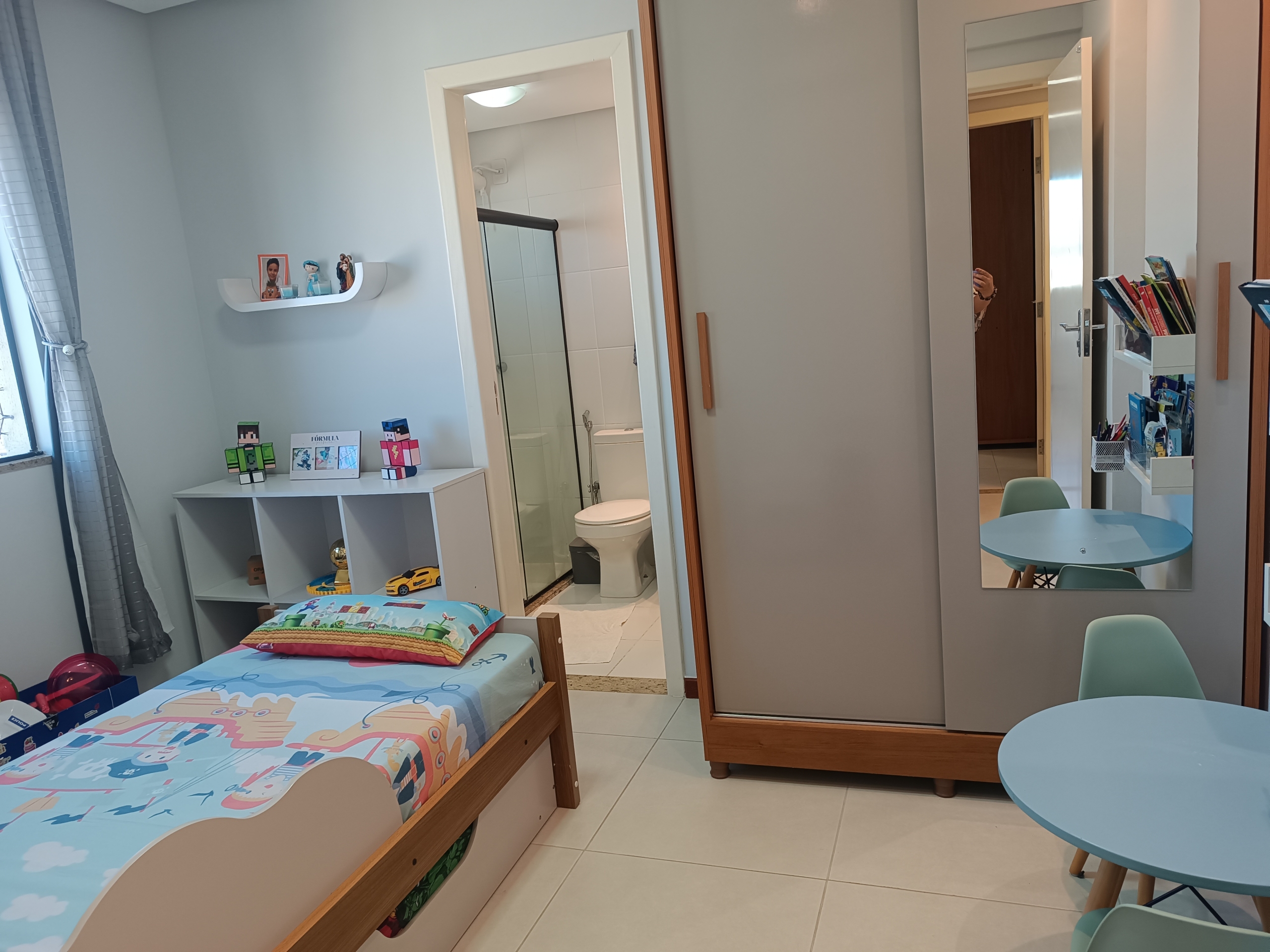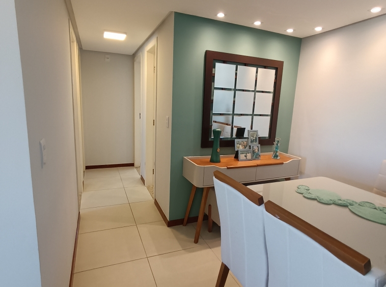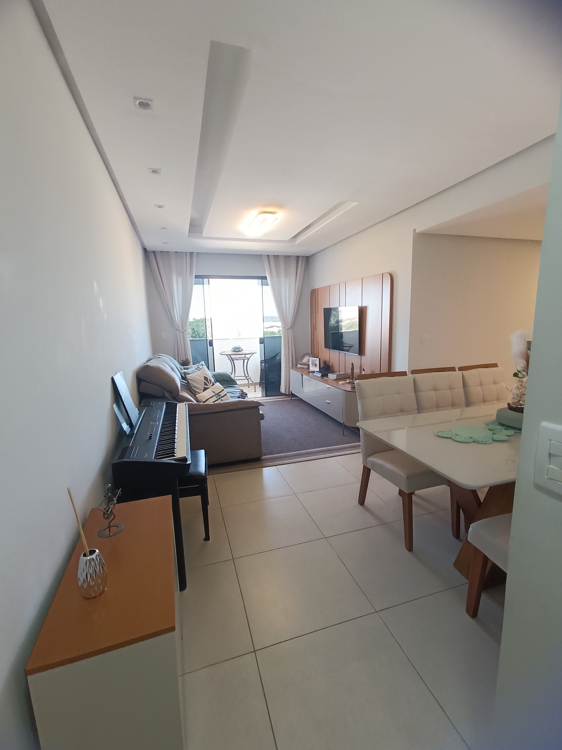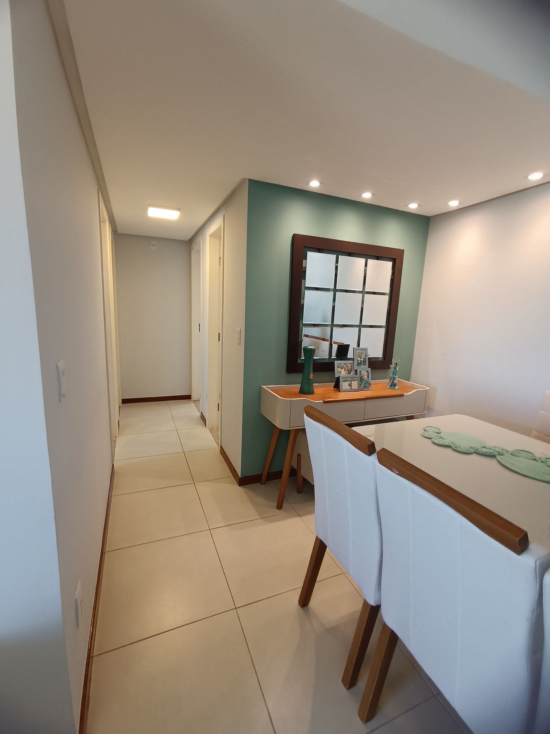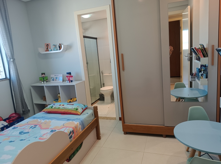 A cozinha é equipada com armários modernos e área de serviço prática, enquanto o terceiro quarto pode ser utilizado como escritório ou quarto de hóspedes, com armário estante planejado para maximizar o espaço.