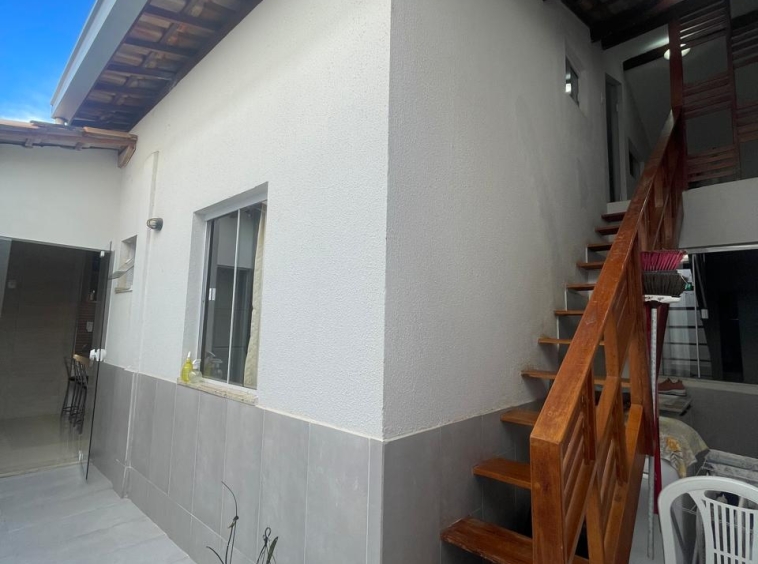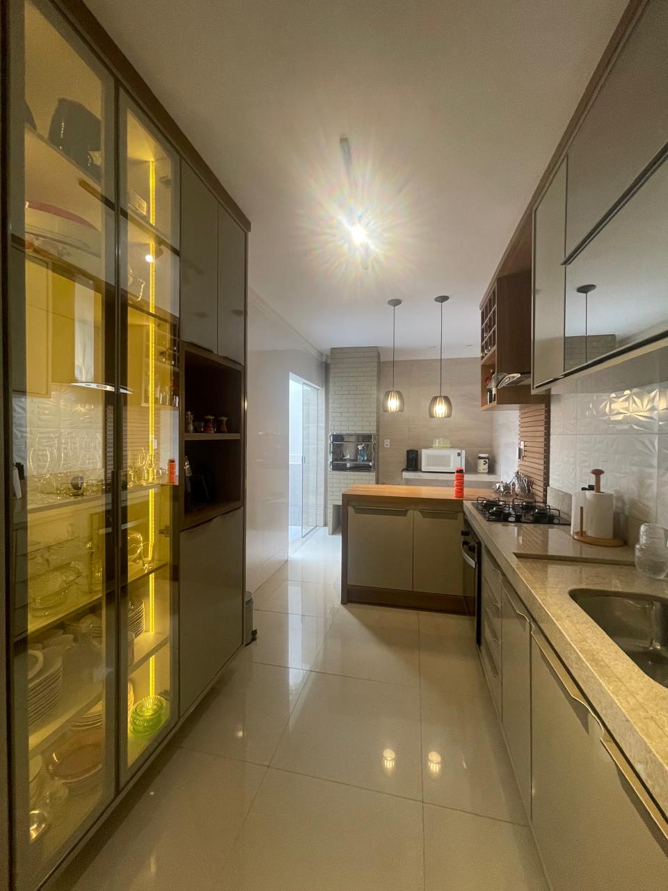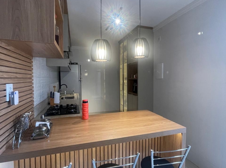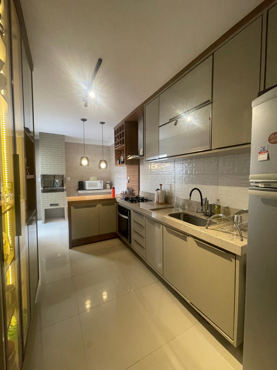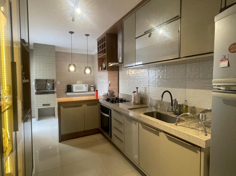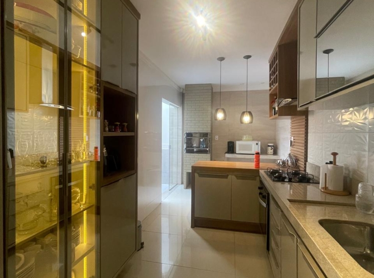 Cozinha com armarios e espaço gourmet com churrasqueira